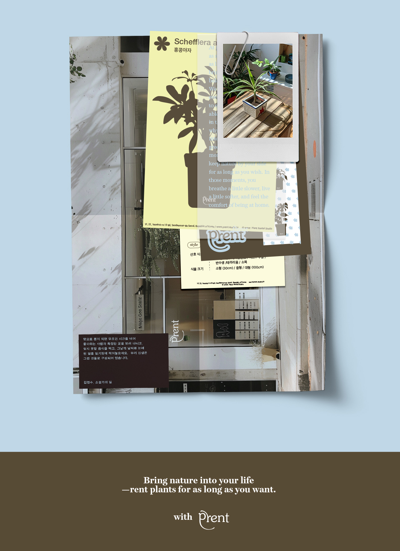 소비자가 원하는 기간 동안 식물을 빌릴 수 있는 서비스입니다. 초보자나 다양한 식물을 키워보고 싶지만 공간적 제한이 있는 사람들을 위한 브랜드로 식물을 키우는 데 있어서 보다 쉽게 접근할 수 있게 합니다.