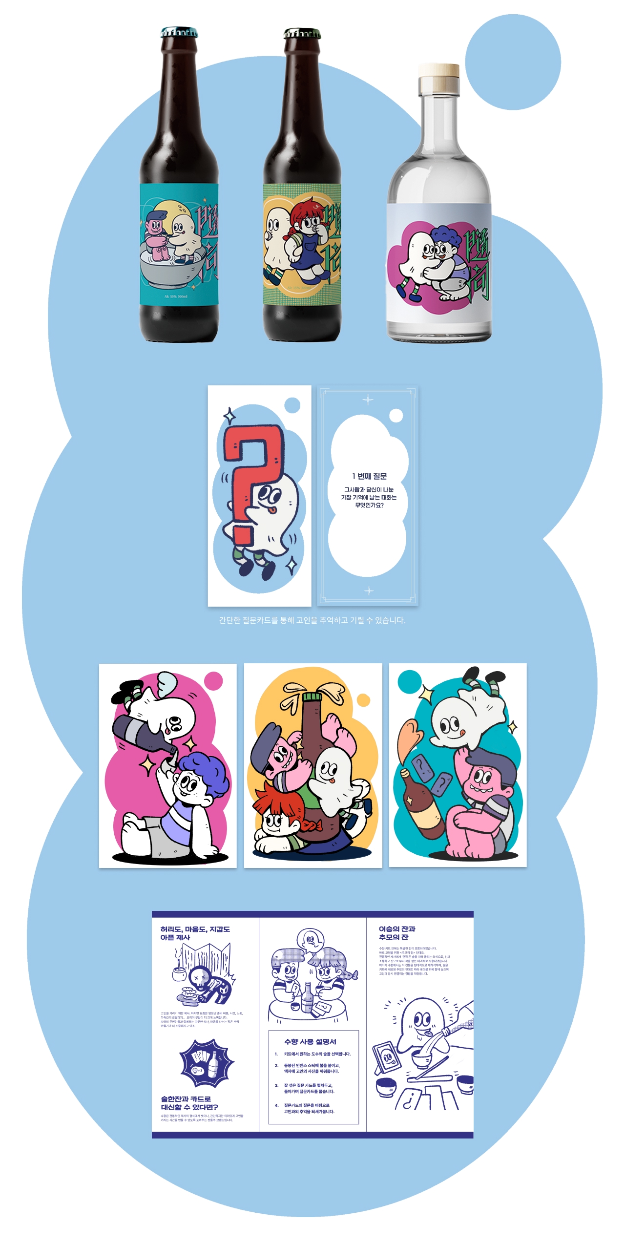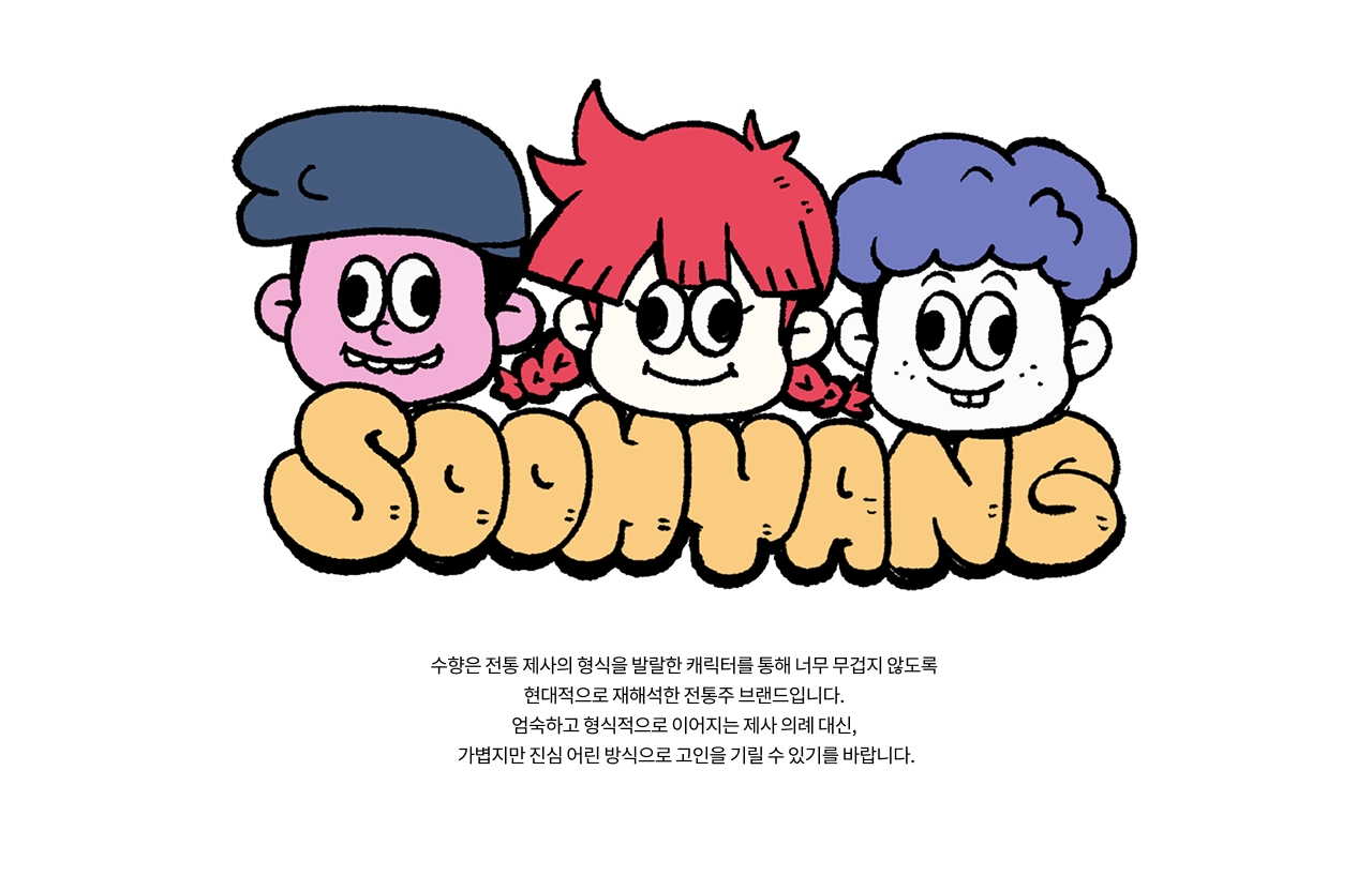 수향은 복잡한 제사 문화 대신, 사랑하는 이들과 함께 술을 나누며 고인을 기릴 수 있는 새로운 방식을 제안하는 전통주 브랜드입니다. 엄숙하고 무거운 제사의 형식에서 벗어나, 발랄한 캐릭터와 가벼운 분위기를 통해 고인과의 소중한 추억을 자연스럽게 떠올릴 수 있도록 디자인했습니다.