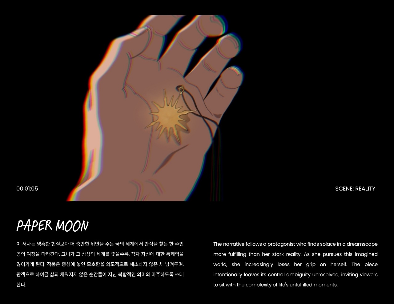 꿈과 현실 사이의 씁쓸하면서도 애틋한 경계를 탐구하는 전통 애니메이션이다. "꿈이 현실보다 더 생생하게 느껴진 적이 있나요?"라는 질문에서 시작된 작품이다.