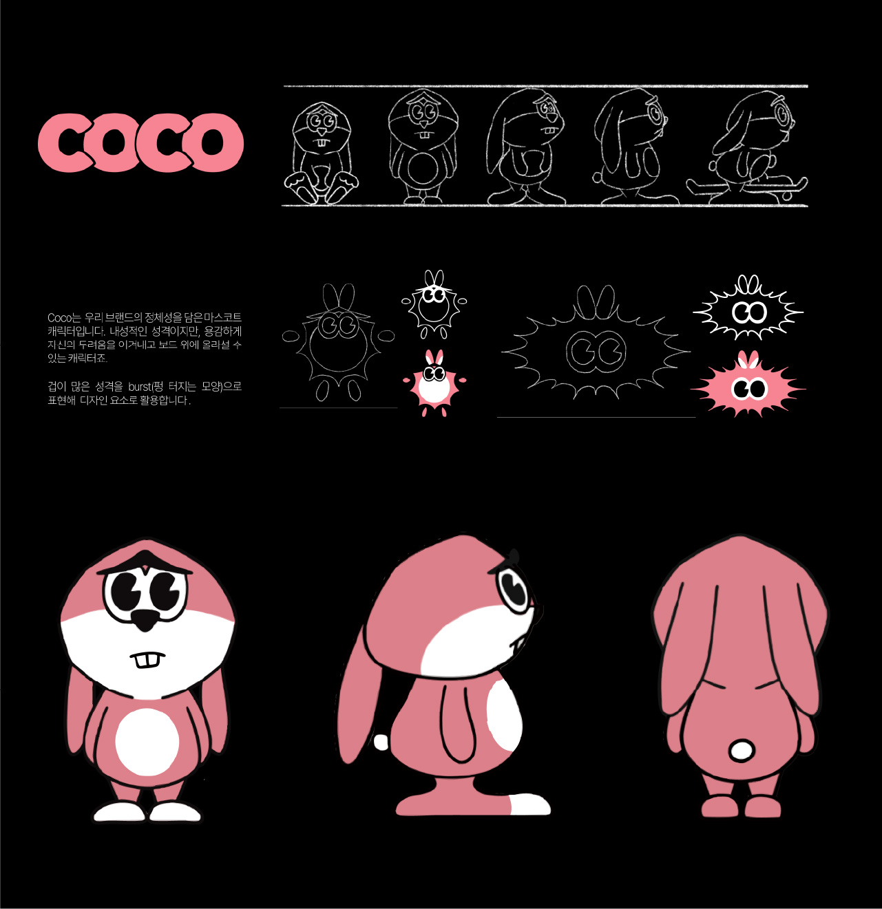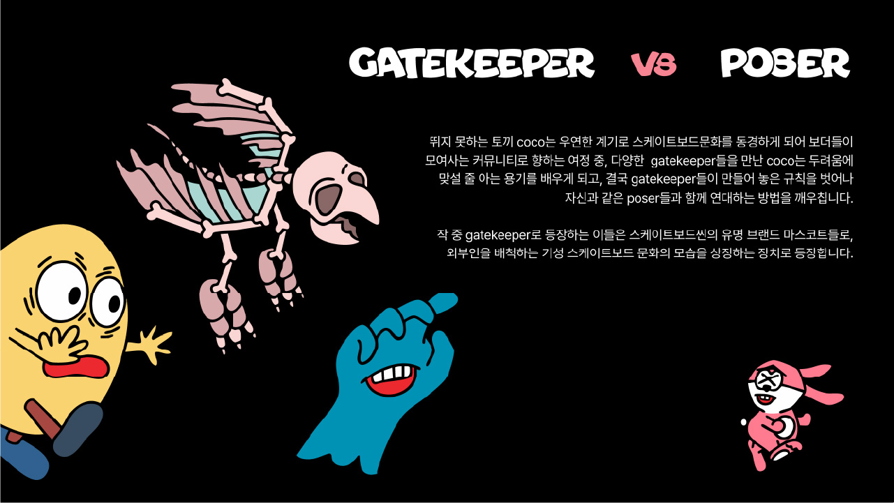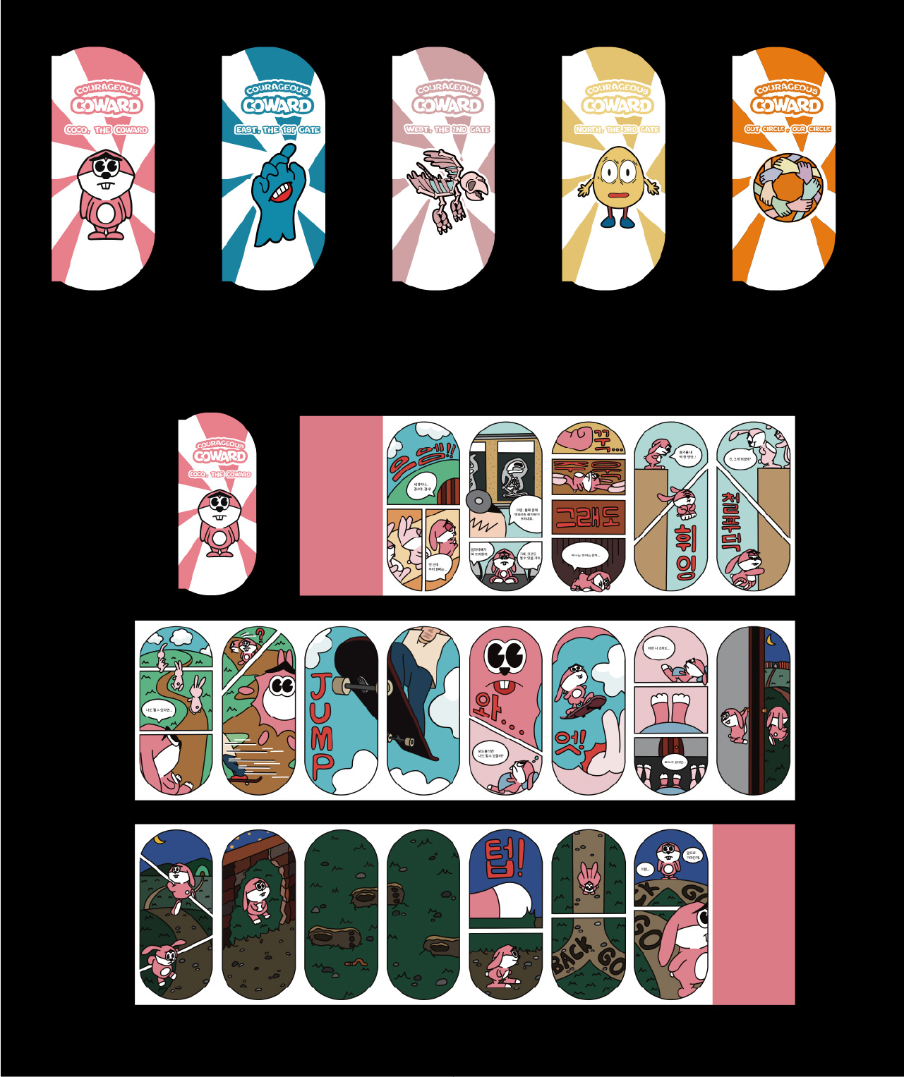 도서 courageous coward는 선망하는 스케이트보드문화를 따라 자신이 속할 커뮤니티를 스스로 찾아나가는 겁쟁이 토끼 coco의 방랑기를 시리즈로 담은 책입니다.