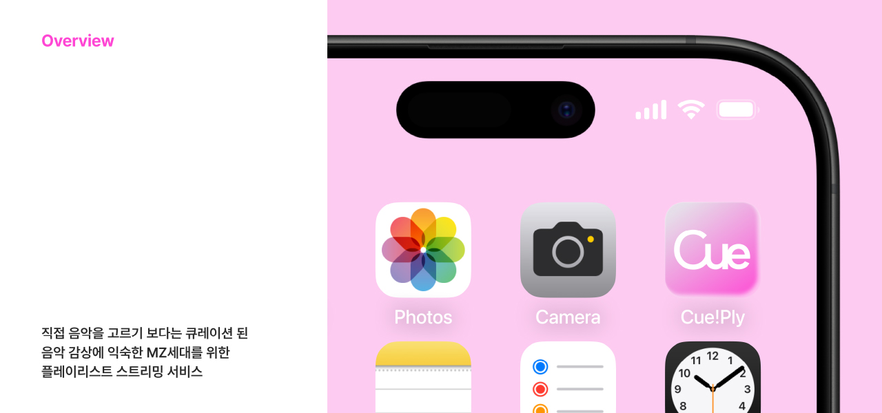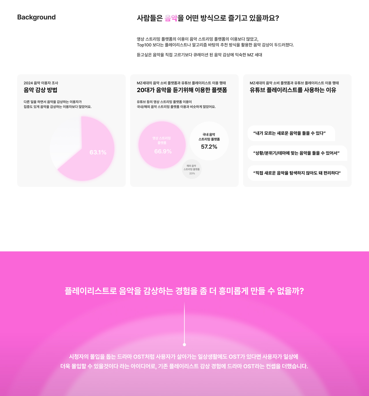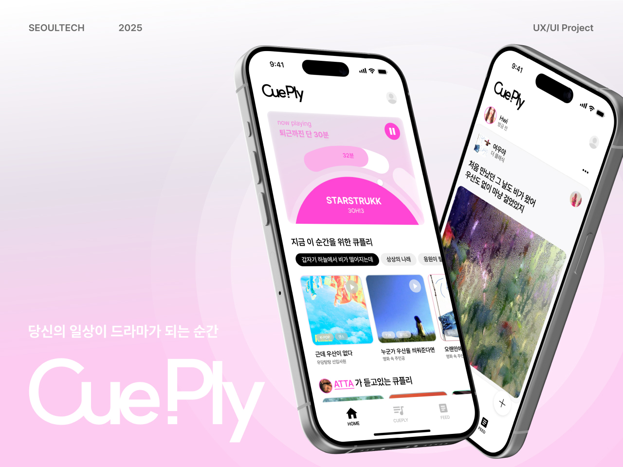 상황 맞춤형 플레이리스트, 큐플리로 사용자가 자신의 행동을 원하는 방향으로 이끌고 현재 상황에 더욱 몰입할 수 있도록 돕는 서비스입니다. 플레이리스트나 큐레이션된 음악을 감상하는 방식에 익숙한 MZ세대를 타겟으로, 기존 플레이리스트 감상 경험에 드라마 OST의 컨셉을 더했습니다. 사용자의 페르소나를 바탕으로 큐플리 캐릭터를 생성하고, 상황 키워드 등을 조합해 큐플리를 생성합니다. 사용자는 직접 플레이리스트를 관리하는 경험을 통해 적극적으로 음악 취향을 넓힐 수 있습니다. 또한 큐플리를 매개로 음악이 일상과 맞아떨어진 순간인 모먼트를 공유하며 친구들과 연결될 수 있습니다.