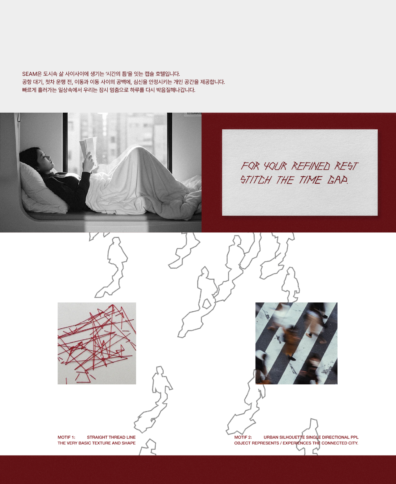 SEAM은 도심 속 이동 사이의 시간의 틈을 쉼의 리추얼로 전환하는 캡슐호텔 브랜드입니다. 개인화된 휴식 경험을 설계하고, 실의 형태를 그래픽 모티프로 확장해 ‘시간의 틈을 잇는 경험’을 시각화했습니다.