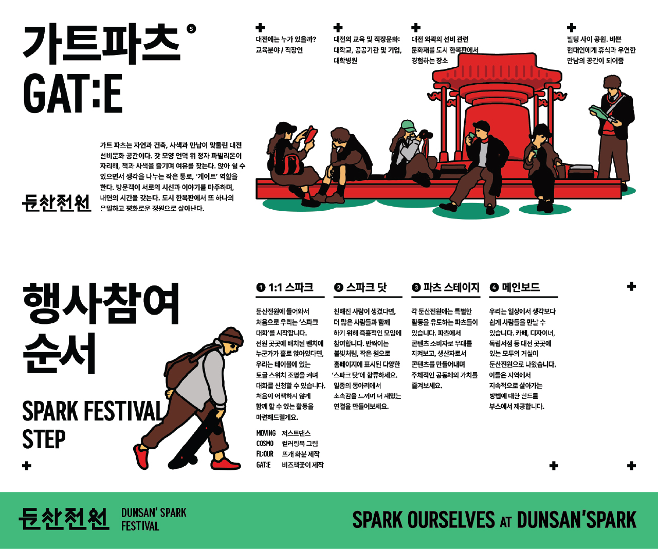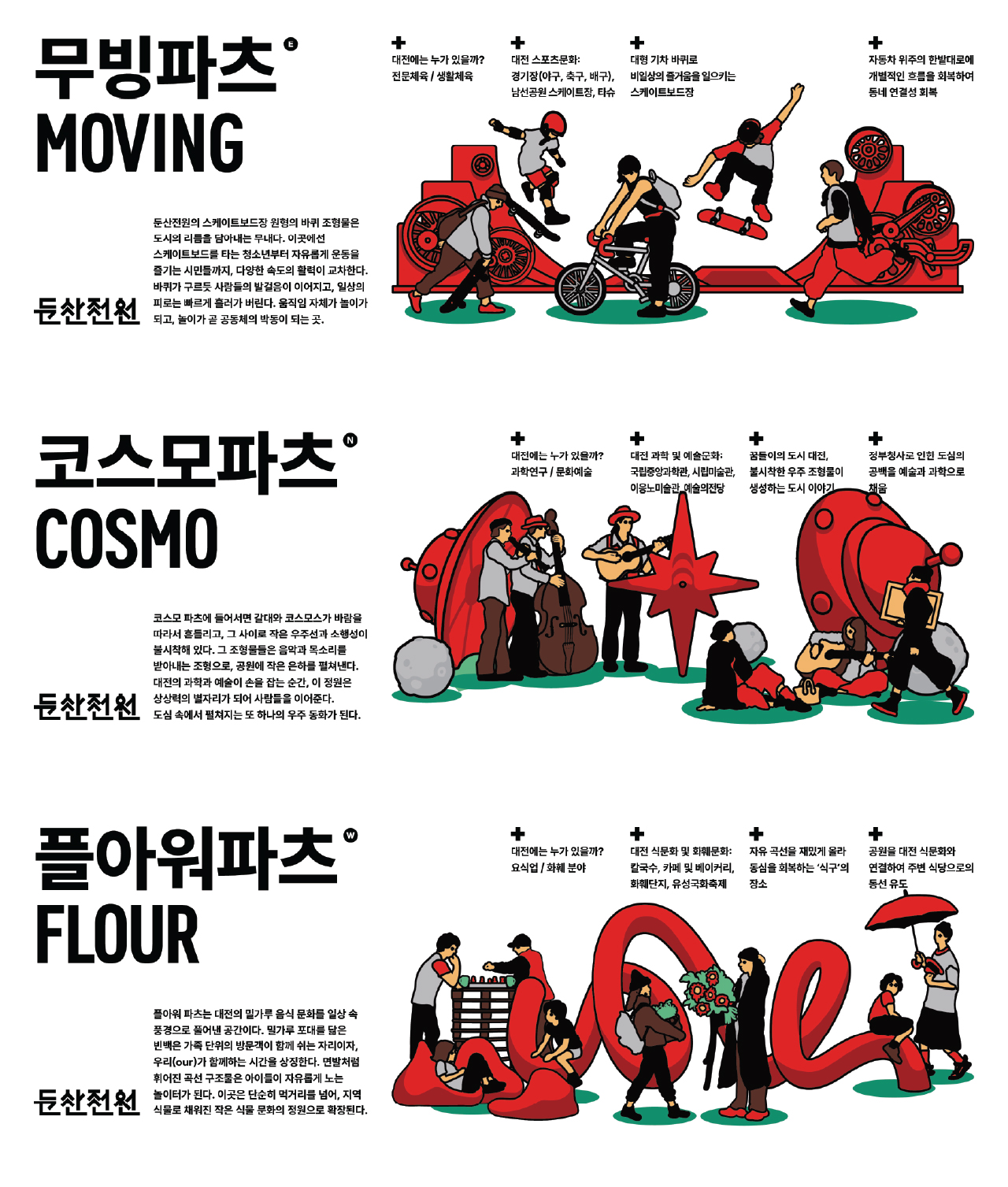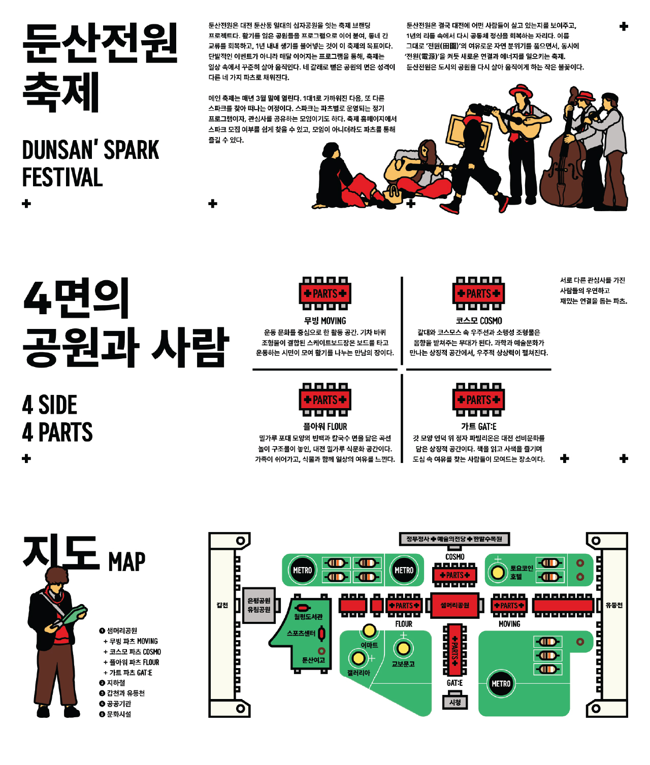 둔산전원은 대전 둔산동의 십자형 공원을 연결 지어 도시 공동체를 회복하는 일상 축제 브랜딩 프로젝트이다. 4면의 공원에서 4개의 취향을 가진 사람들을 만난다. 파노라마 장면 속 파츠(주요 시설)는 만남을 활성화하는 스파크(프로그램)를 일으킨다. 전시는 웹과 프로그램 굿즈로 구성되어 있다.