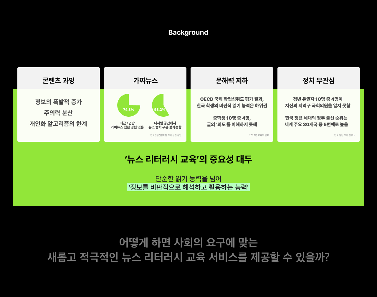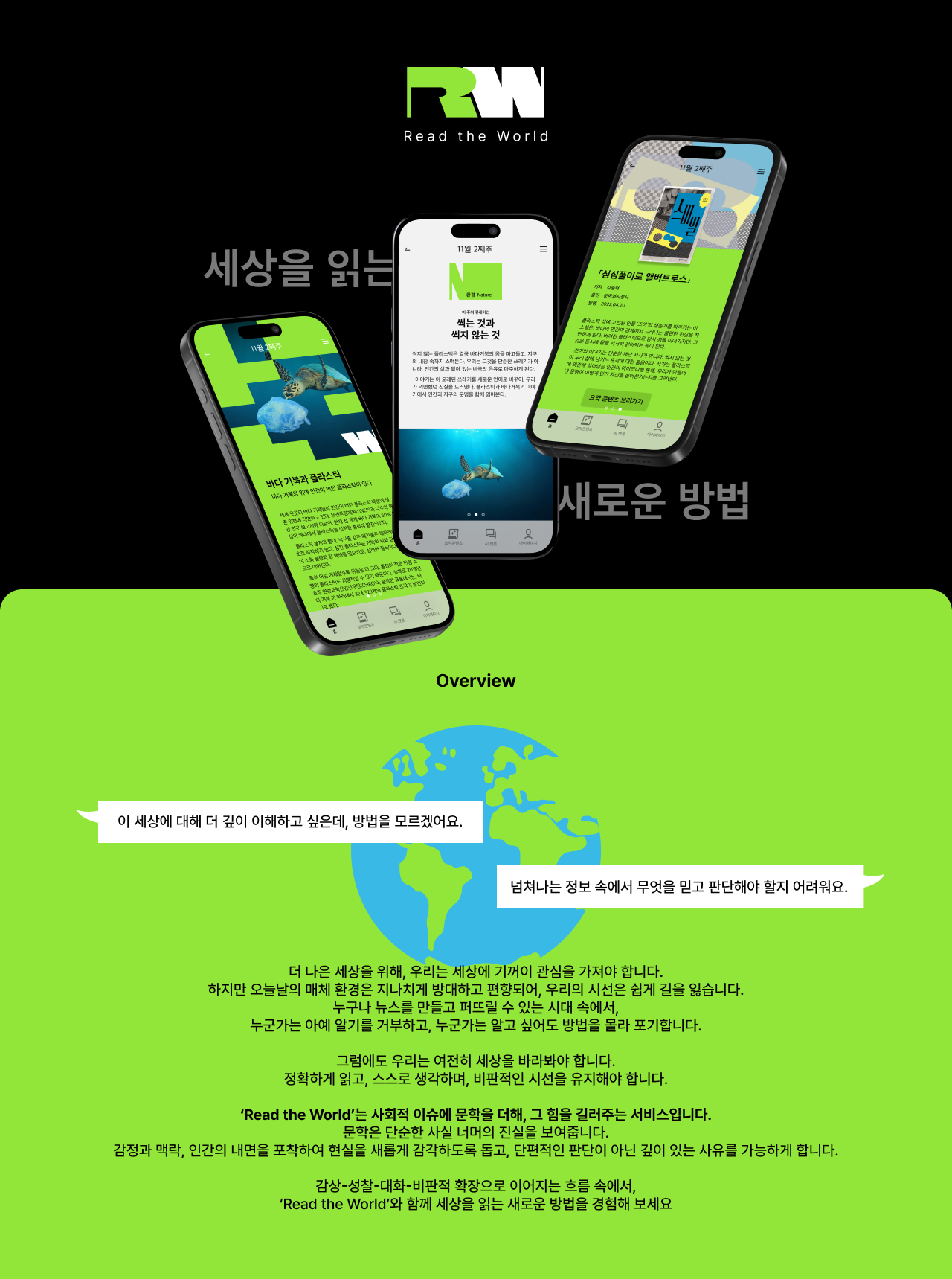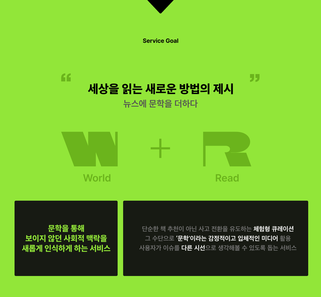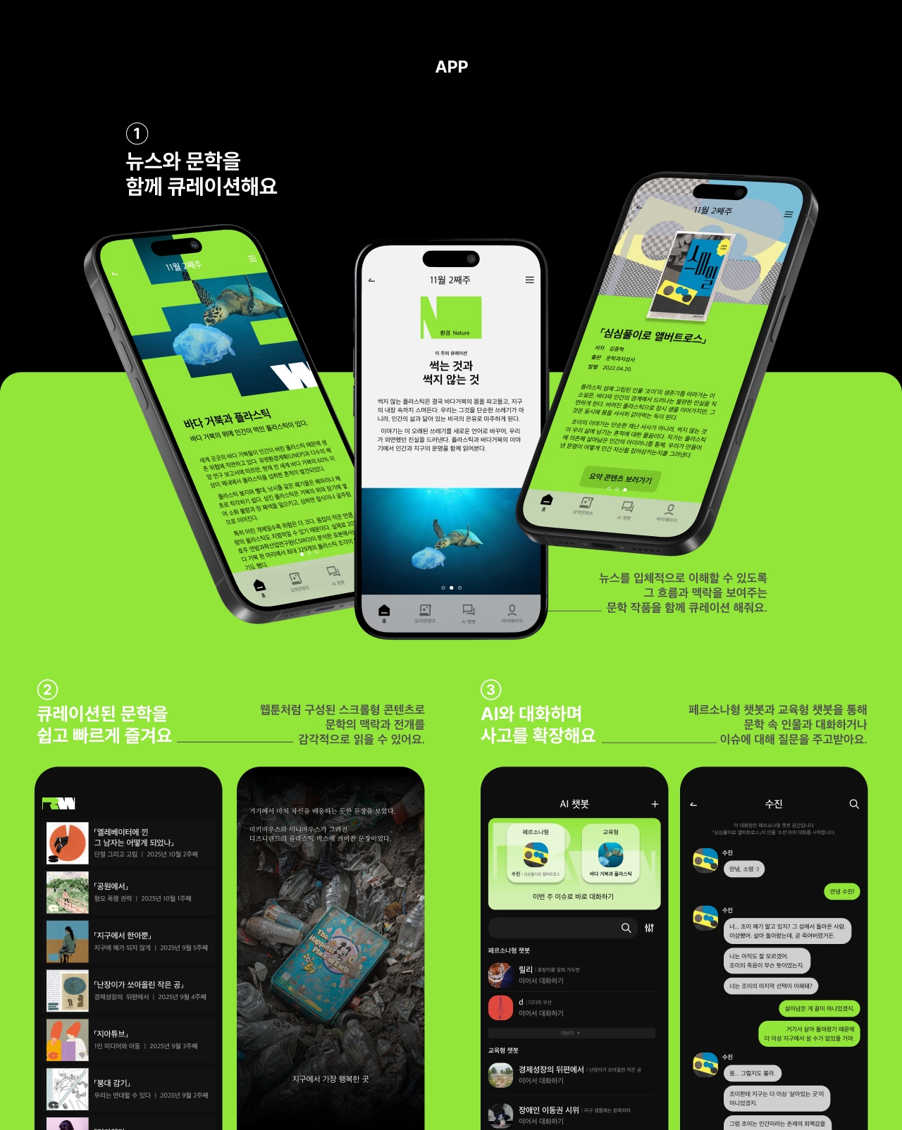 뉴스를 문학과 함께 읽는 큐레이션 기반 뉴스 리터러시 앱. 주마다 하나의 뉴스와 문학 작품을 큐레이션해 문학 요약 콘텐츠와 함께 제공하며, 이를 통해 세상을 비판적으로 이해하는 새로운 독서 경험을 제안한다.