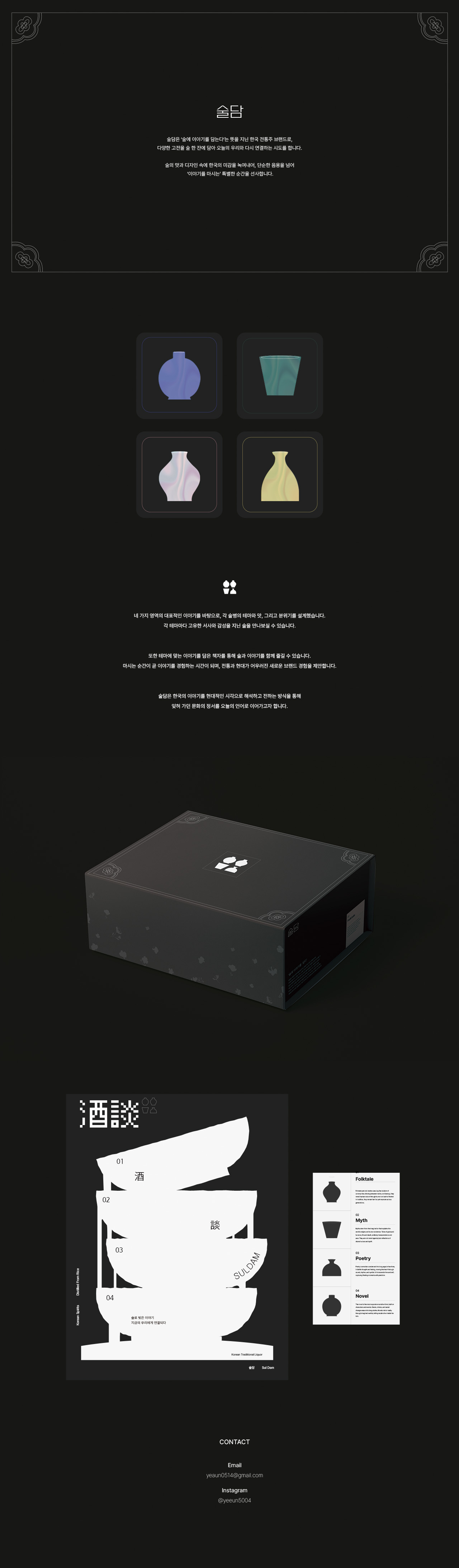 술담은 ‘술에 이야기를 담는다’는 뜻을 지닌 한국 전통주 브랜드로, 신화·시가·소설·민속 서사 등 다양한 한국의 고전 이야기를 술 한 잔에 담아냅니다. 잊히기 쉬운 고전을 술이라는 매개를 통해 새롭게 경험하고 오늘의 우리와 다시 연결하는 시도를 합니다.