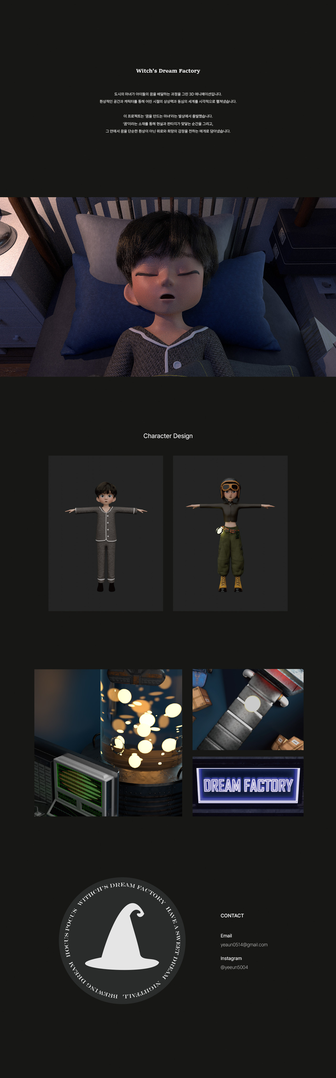 도시의 마녀가 아이들의 꿈을 배달하는 과정을 그린 3D 애니메이션입니다. 환상적인 공간과 캐릭터를 통해 어린 시절의 상상력과 동심의 세계를 시각적으로 표현했으며, 꿈이라는 소재를 통해 현실과 판타지가 교차하는 특별한 이야기를 담아냈습니다.