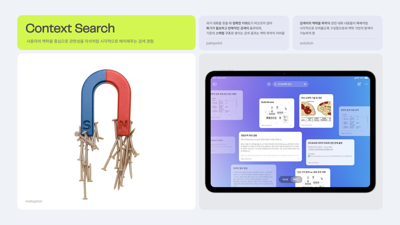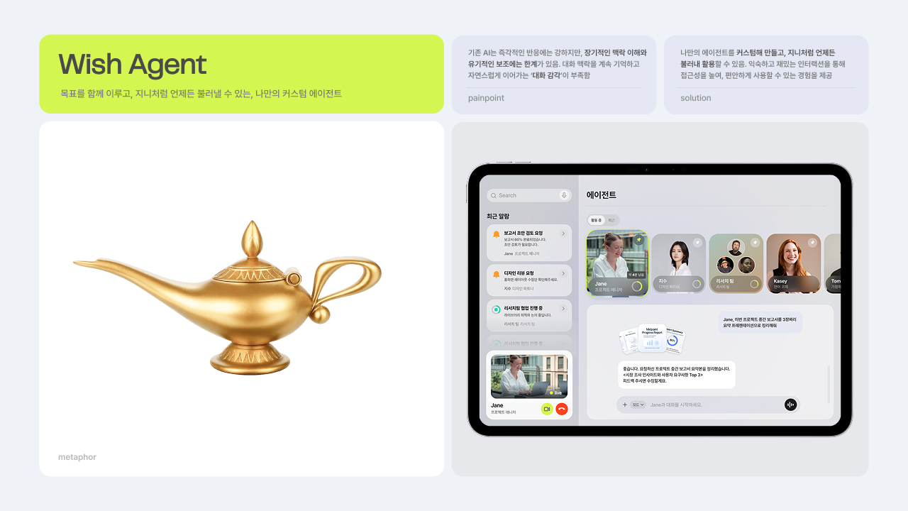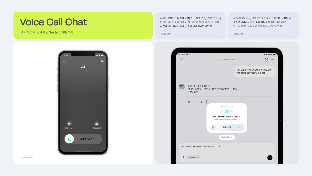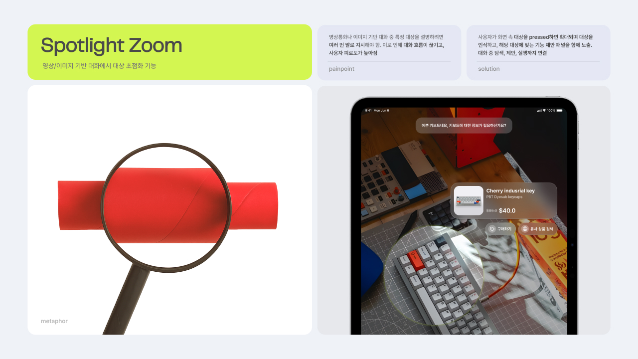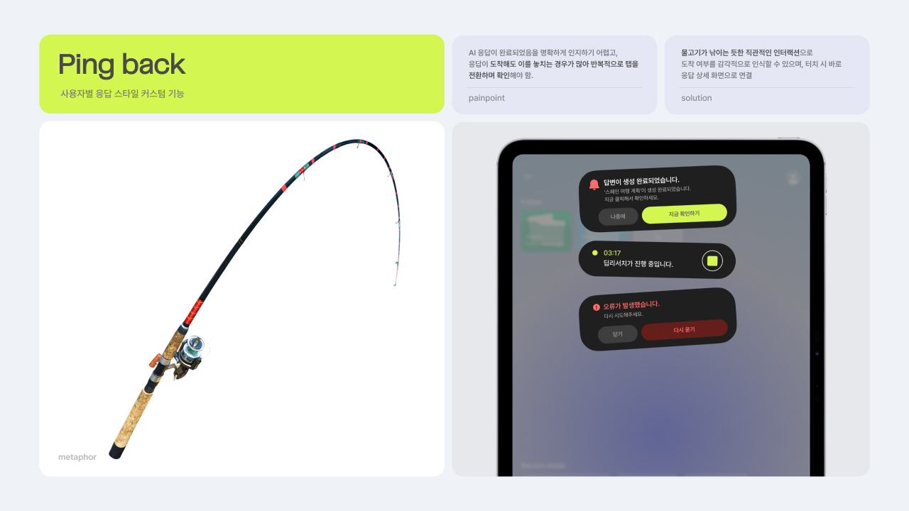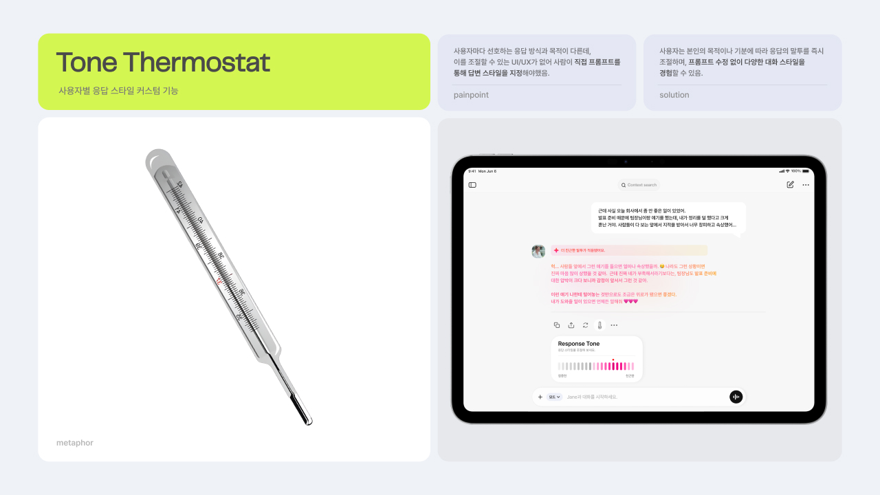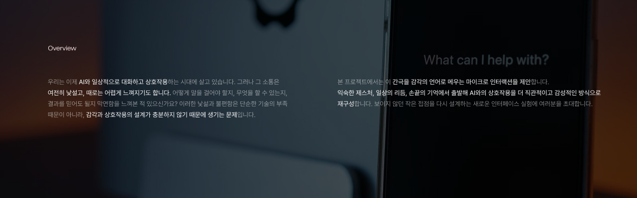 AI와 사람 간의 감각적이고 부드러운 소통을 위한 마이크로 인터랙션 디자인 프로젝트입니다. 익숙한 제스처와 일상 속 메타포를 활용한, 낯선 기술의 세계를 친숙한 감각으로 잇는 8가지 새로운 기능을 제안합니다. 이를 통해 AI와의 관계를 ‘사용’에서 ‘소통’으로 확장합니다.